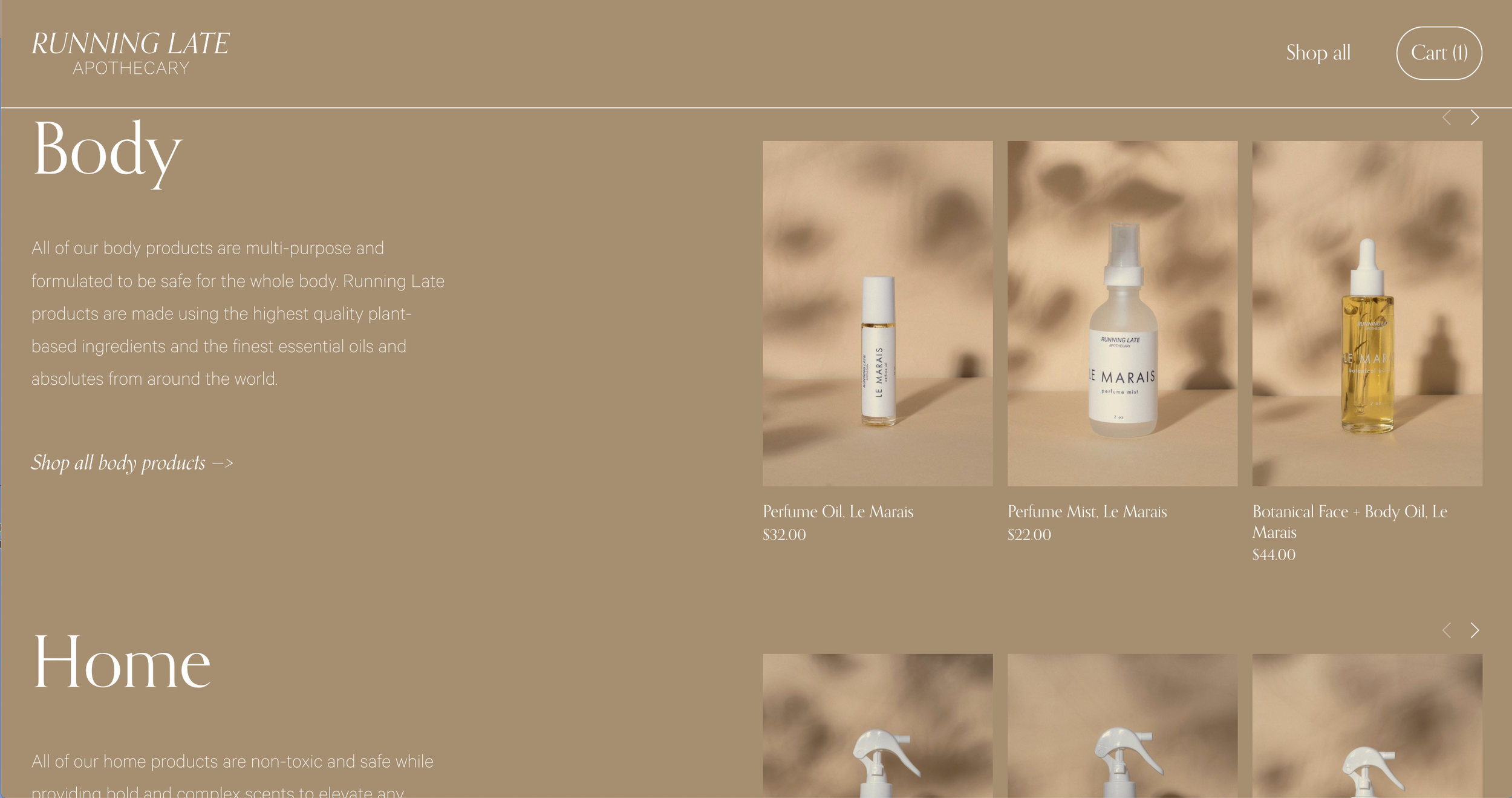 We couldn’t forget our product website, Running Late Apothecary! The inspiration for this site was drawn from film photos of world travel, fields of windswept flowers and texture. We wanted to offer a sumptuous web experience while prioritizing ease of shopping.